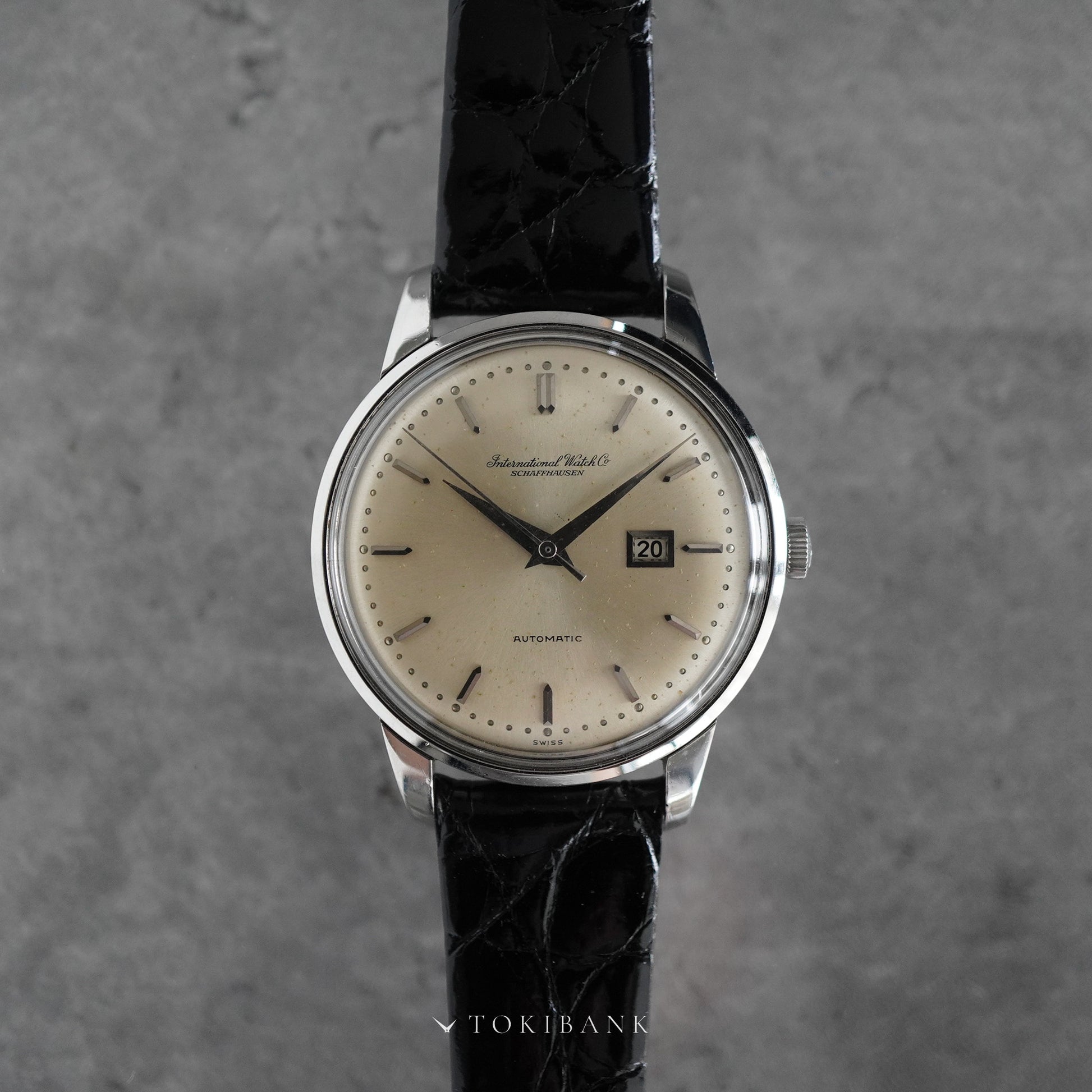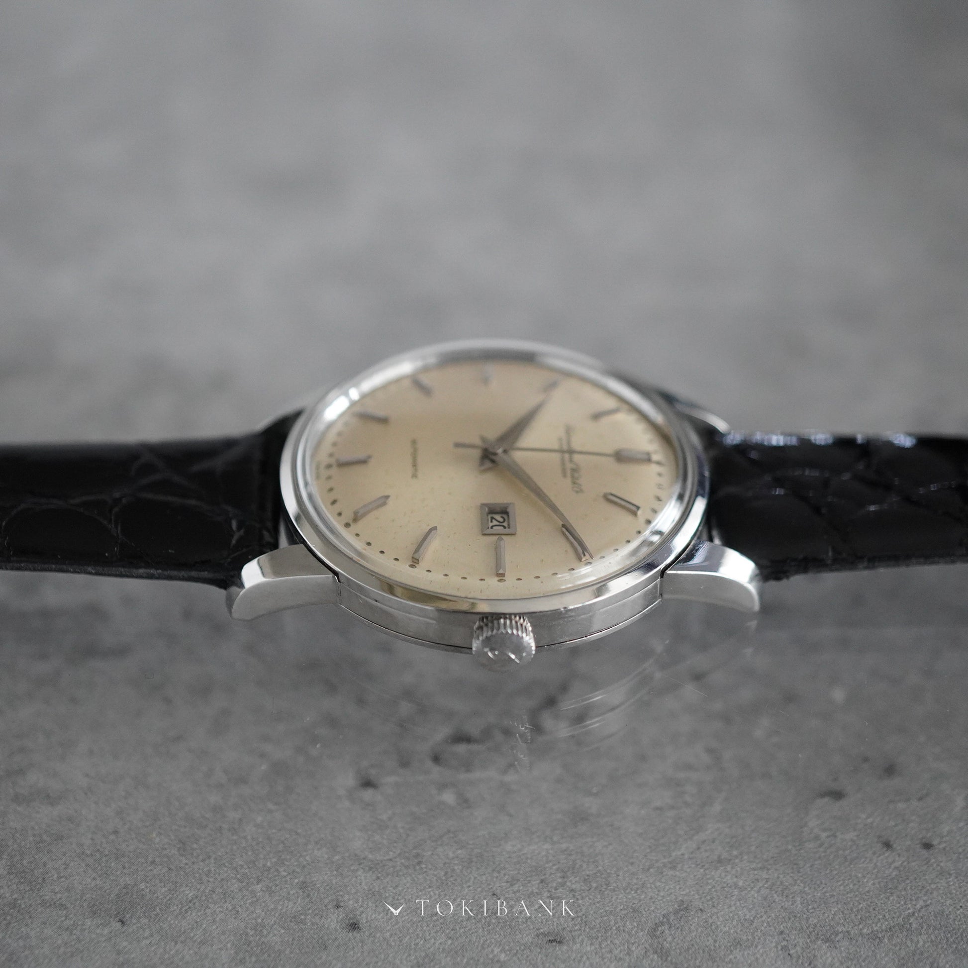 シルバーダイヤルにドーフィン針と砲弾インデックスを備えたシンプルなデザインで、落ち着いた雰囲気を持っています。ダイヤルには多少の経年変化が見られますが、視認性を損なうものではなく、ケースもシャープなプロポーションを維持しています。