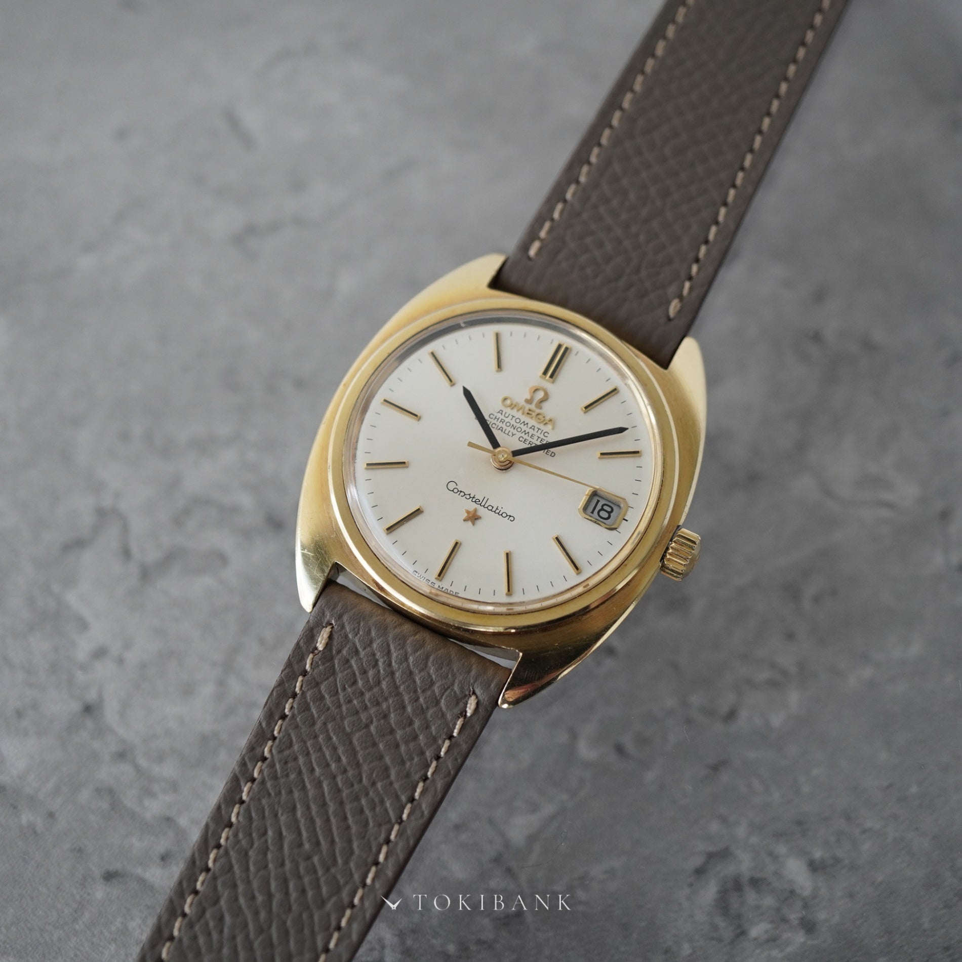 Omega Constellation Ref.168.017. Designed by Gérald Genta with the distinctive C-Line case, this model features a gold-capped case and houses the chronometer-rated automatic Cal.564 movement. Light aging is visible, but the overall condition remains good and the quick-set date operates smoothly.