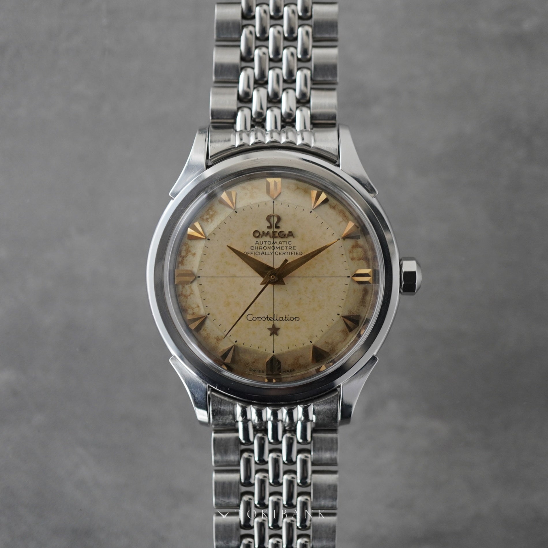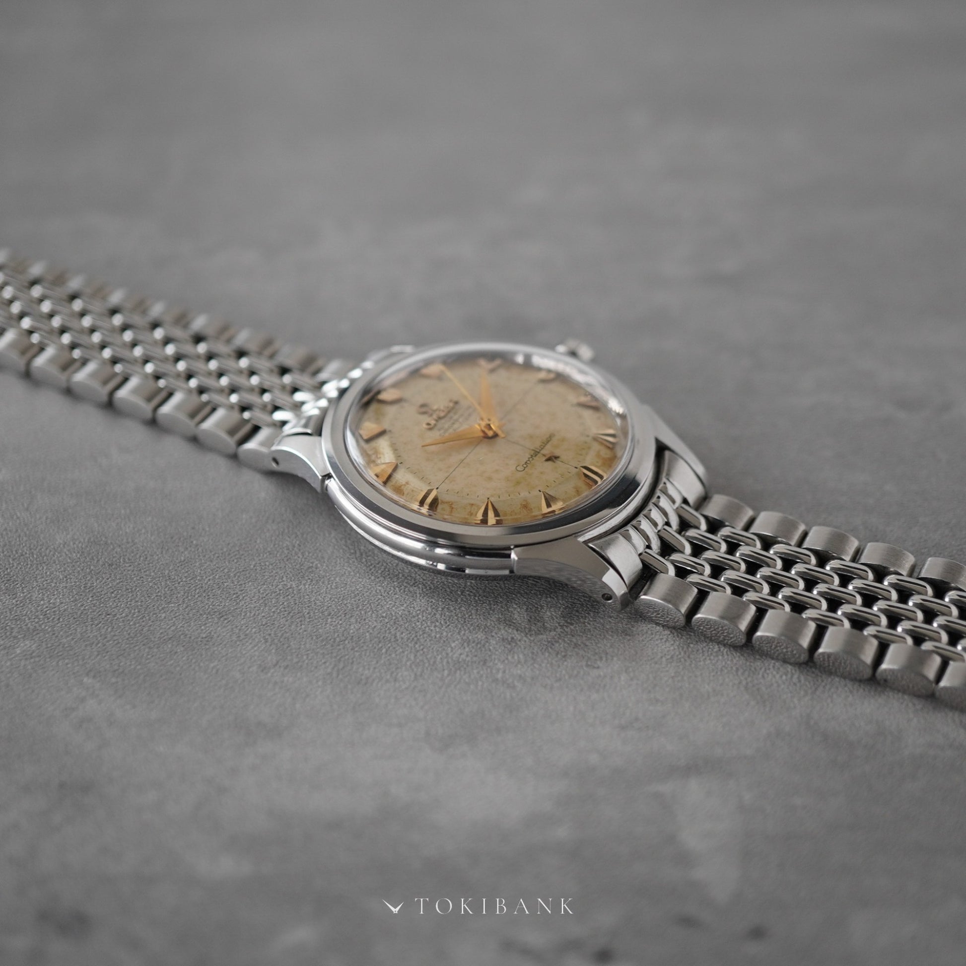 The Omega Constellation Ref. 2852 is a representative model from the late 1950s and an important piece in the early era of the Constellation line. It features a distinctive case design with unique lugs and a three-dimensional pie-pan dial, both of which are defining characteristics of the period. The watch is powered by the chronometer-certified automatic Caliber 505, a high-grade movement used in Omega’s top models of the time, known for its accuracy and durability. The dial has developed an ivory tone with attractive aging and retains its original pie-pan structure with a stepped profile from the center to the outer edge, giving it strong visual depth. The hands and indexes are executed in a gold-tone combination of wedge-shaped indices and dauphine hands. The caseback features the signature Observatory medallion, and the overall construction of the case remains solid and well-defined. The watch is fitted with the Omega original beads-of-rice bracelet, Ref. 1036 / 11, which complements the case design and offers excellent wearing comfort. This example combines key traits that define early Constellation models—pie-pan dial and wedge indexes—making it a particularly desirable configuration among collectors.