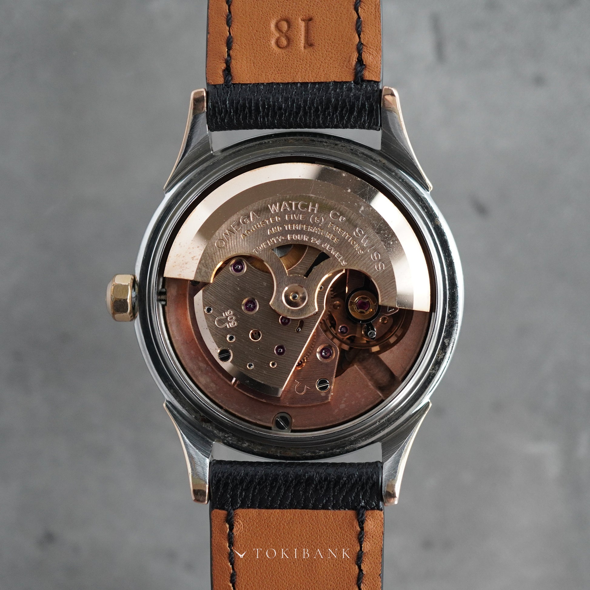 本個体はブラックのワッフルダイヤルにダイヤモンドインデックス、ドーフィン針を組み合わせた仕様。ピンクゴールドのキャップゴールドケースに合わせ、リューズ・インデックス・針・レターまですべてピンクゴールドで統一された希少なディテールを備えています。