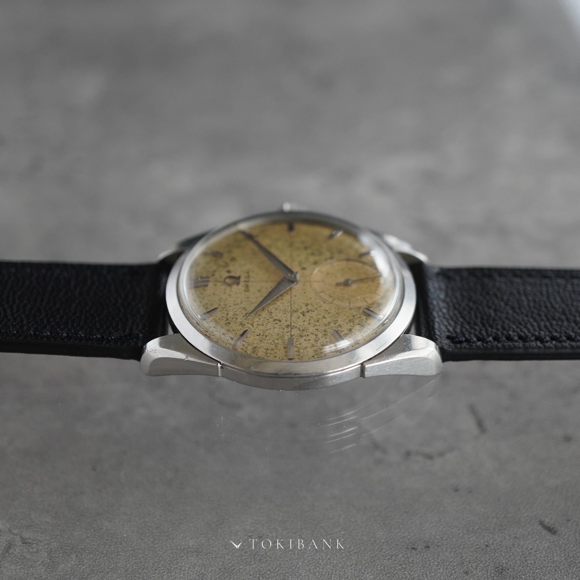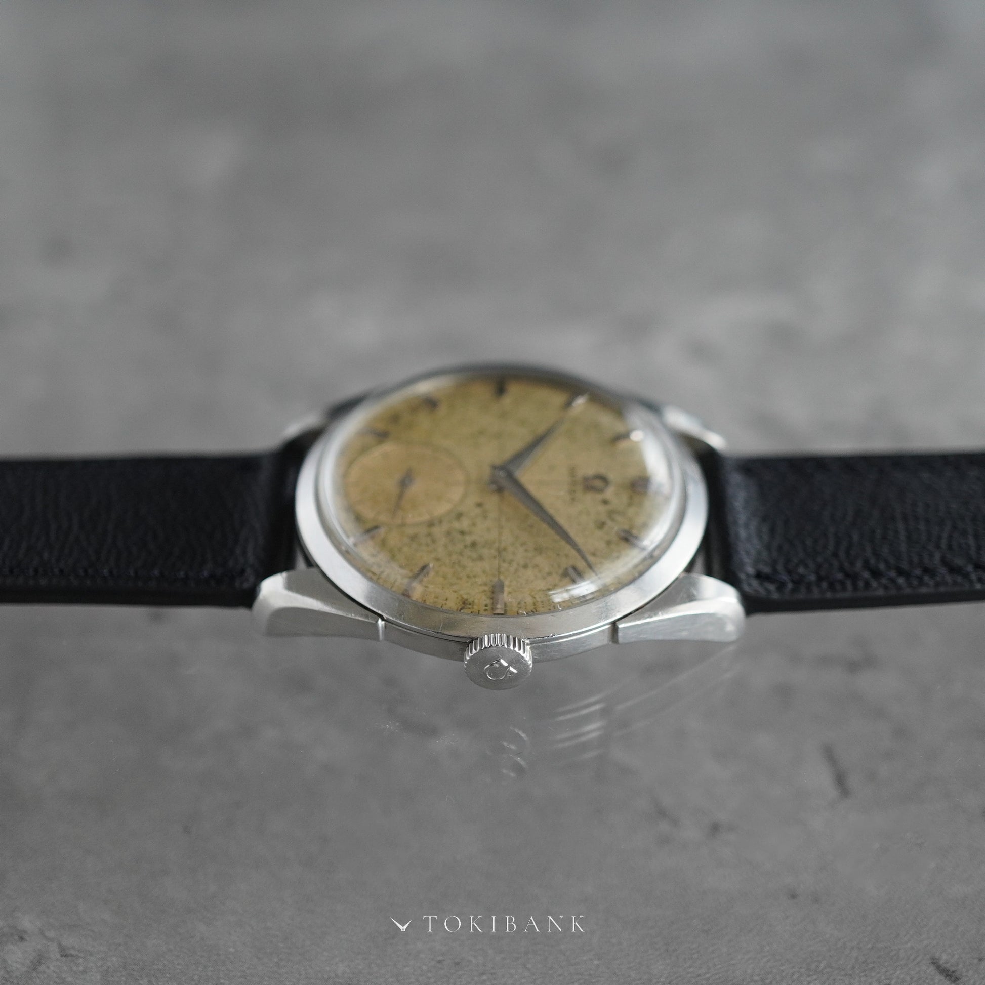 1950年代に製造された Ref.2900-1 は、「30mmキャリバー」シリーズを搭載したオメガのクラシックモデルです。本個体は Cal.267 を搭載したスモールセコンド仕様で、砲弾型インデックスにクロスラインを配したダイヤルとなっています。