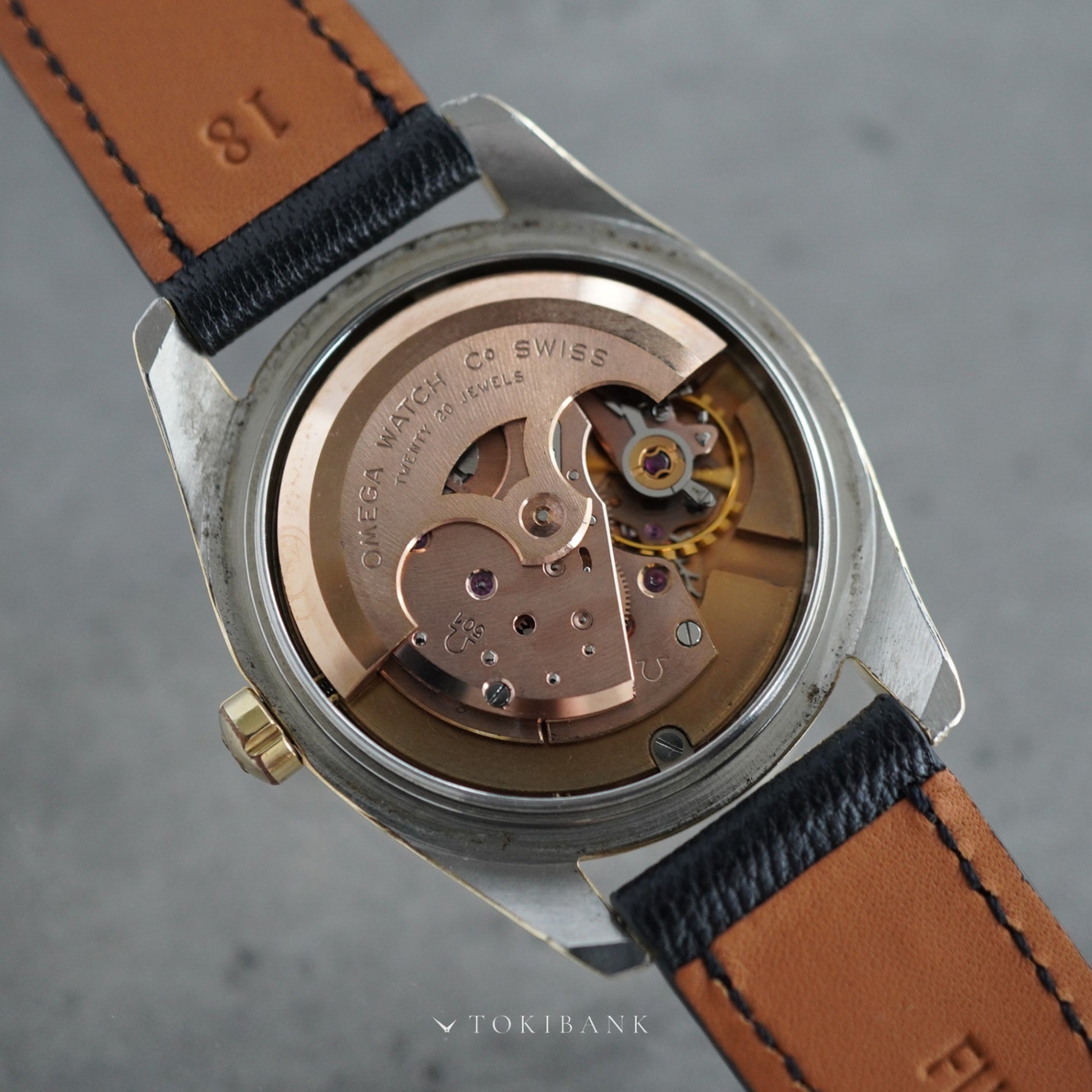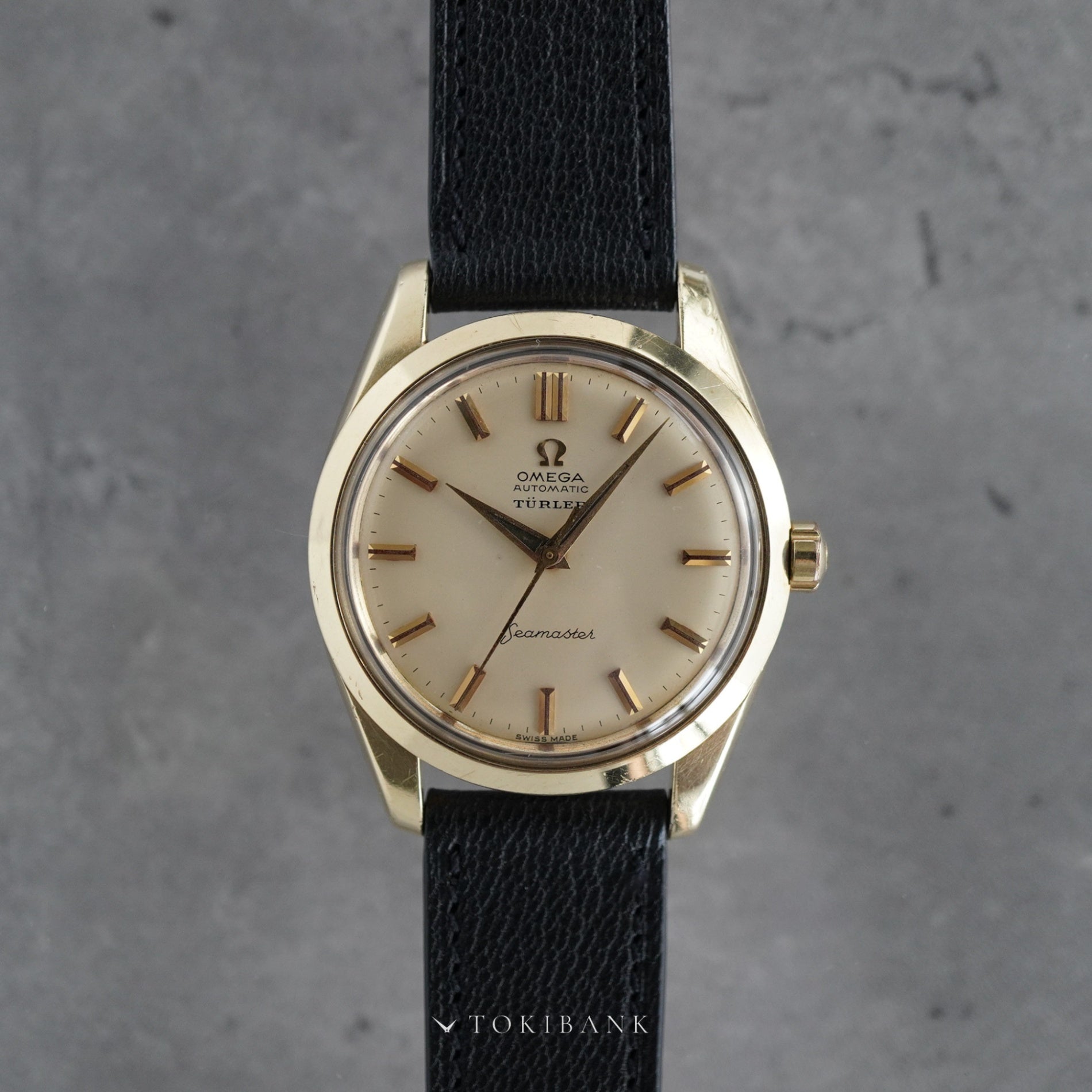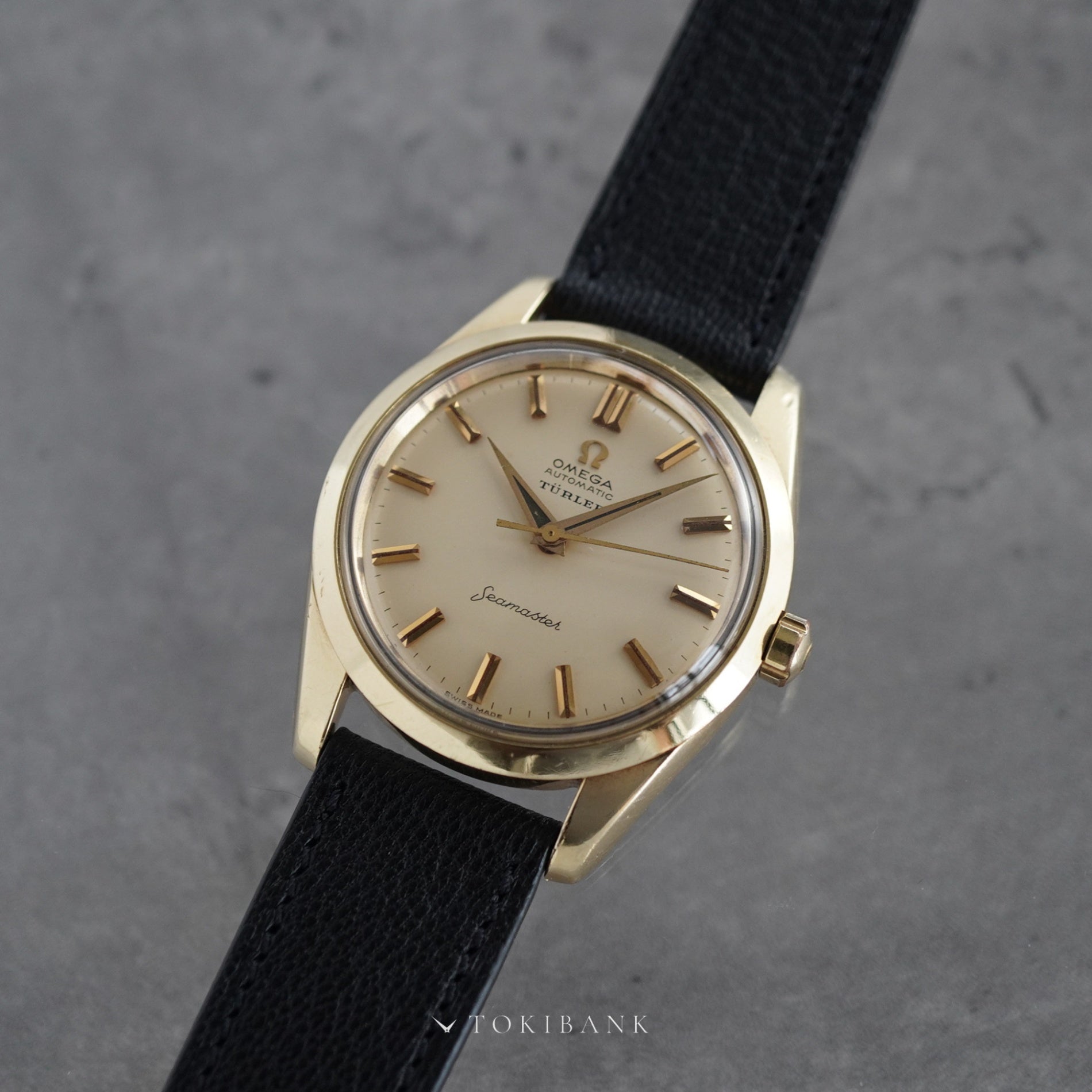 金張りされたゴールドトップのケースにアイボリーカラーの文字盤を組み合わせた構成となっております。 文字盤の「Seamaster」ロゴ下には、スイスの高級宝飾店「TÜRLER(チューラー)」の刻印が配されています。 ケース側面には軽度の打痕やスレ傷が見られ、リューズトップにはメッキの剥がれが一部確認できます。 ムーブメントには実用性の高いCal.501を搭載しており、メンテナンス済みで動作状態は良好です。