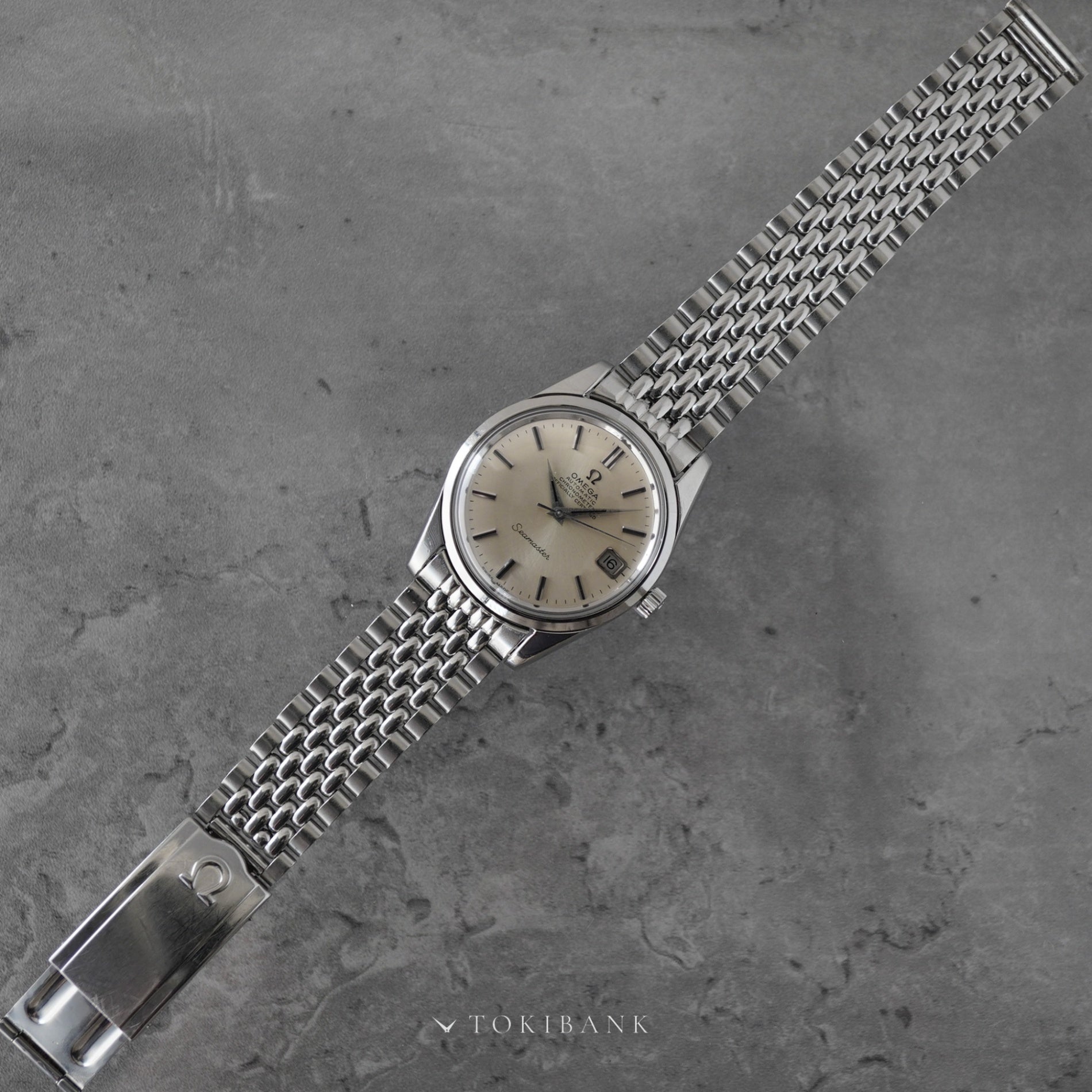 OMEGA Seamaster Ref.166.010は1960年代から1970年代初頭にかけて製造されたモデルで、ドレスとスポーツの中間に位置づけられる汎用性の高い一本です。クロノメーター仕様のRef.166.010は、同時期のコンステレーションに匹敵する精度と仕上げを持つモデルとして知られ、内部にはコンステレーションにも採用されたハイエンドムーブメントCal.564を搭載しています。 クロノメーター仕様モデルでは“Chronometer”の表記が入る点が特徴で、サンレイ仕上げが施された文字盤は、経年変化によりわずかにシャンパンカラーへと変化しています。ケースは太いラグを備えたデザインで、スクリューバック仕様の裏蓋により実用時計として十分な耐久性を確保しています。 ブレスレットには、腕馴染みの良い当時の純正ライスブレスレットRef.1036 / 11が装着されています。
