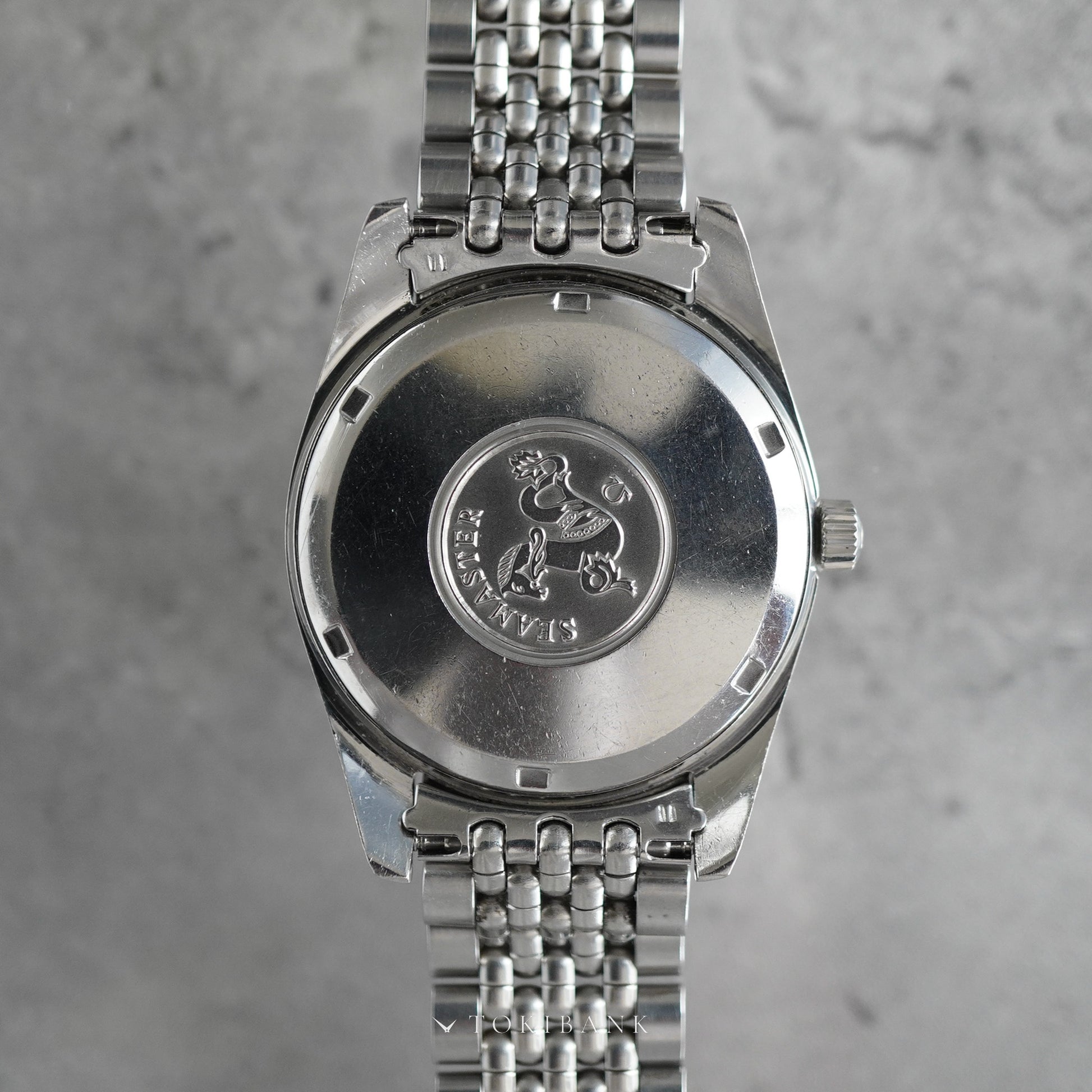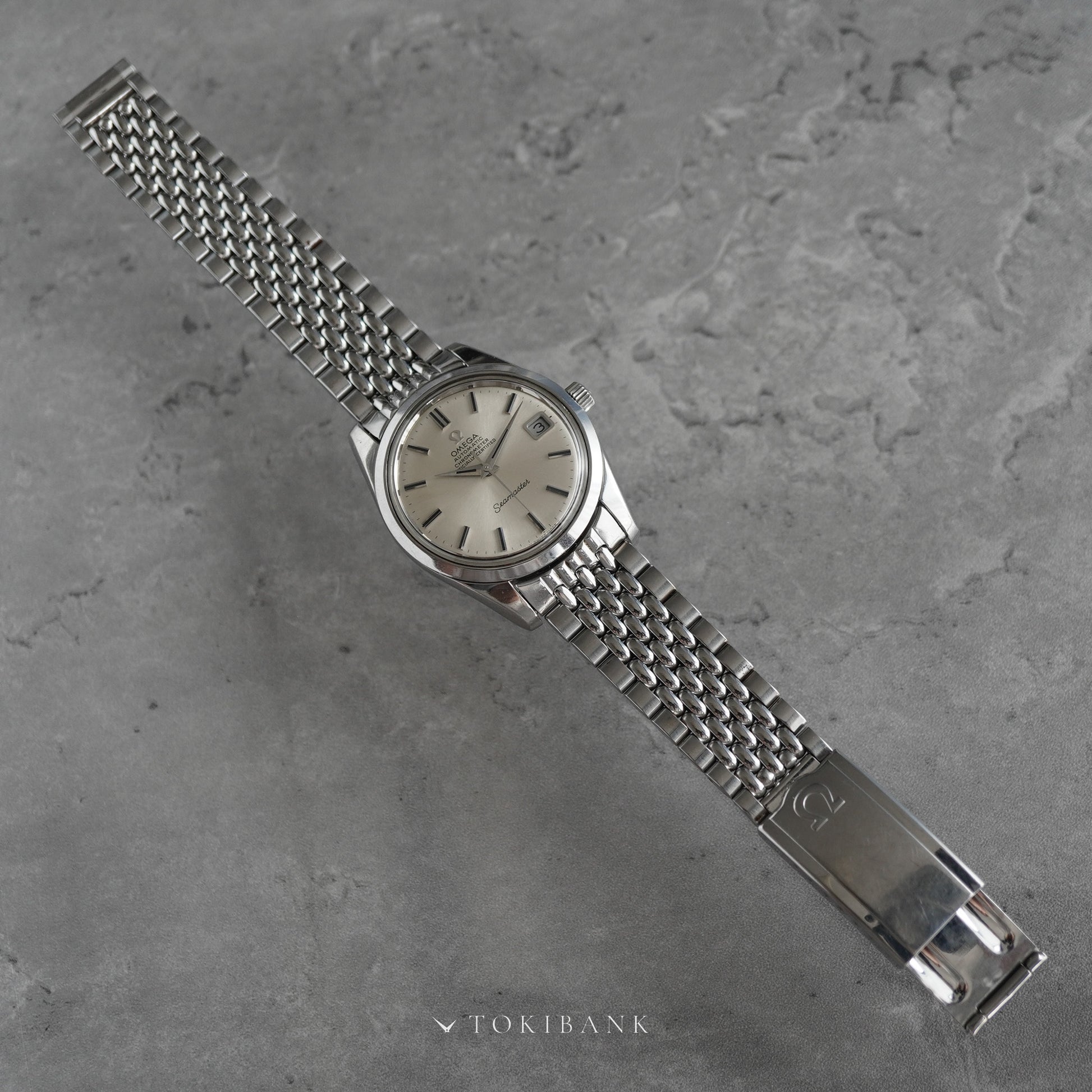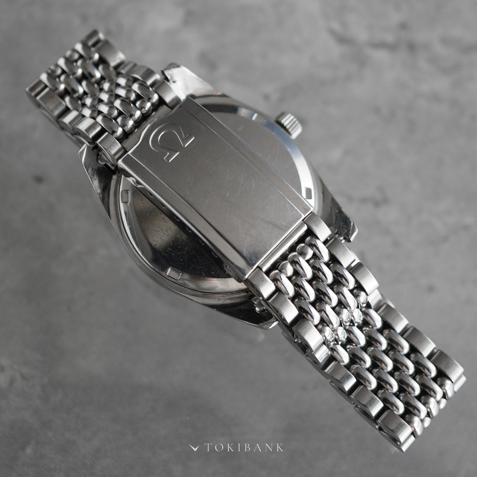 サンバースト仕上げの文字盤には目立った変色や劣化がなく、ファセットインデックスやドーフィン針も良好な状態を保っています。全体的にコンディションは優れており、オメガ純正のライスブレスが装着されています。