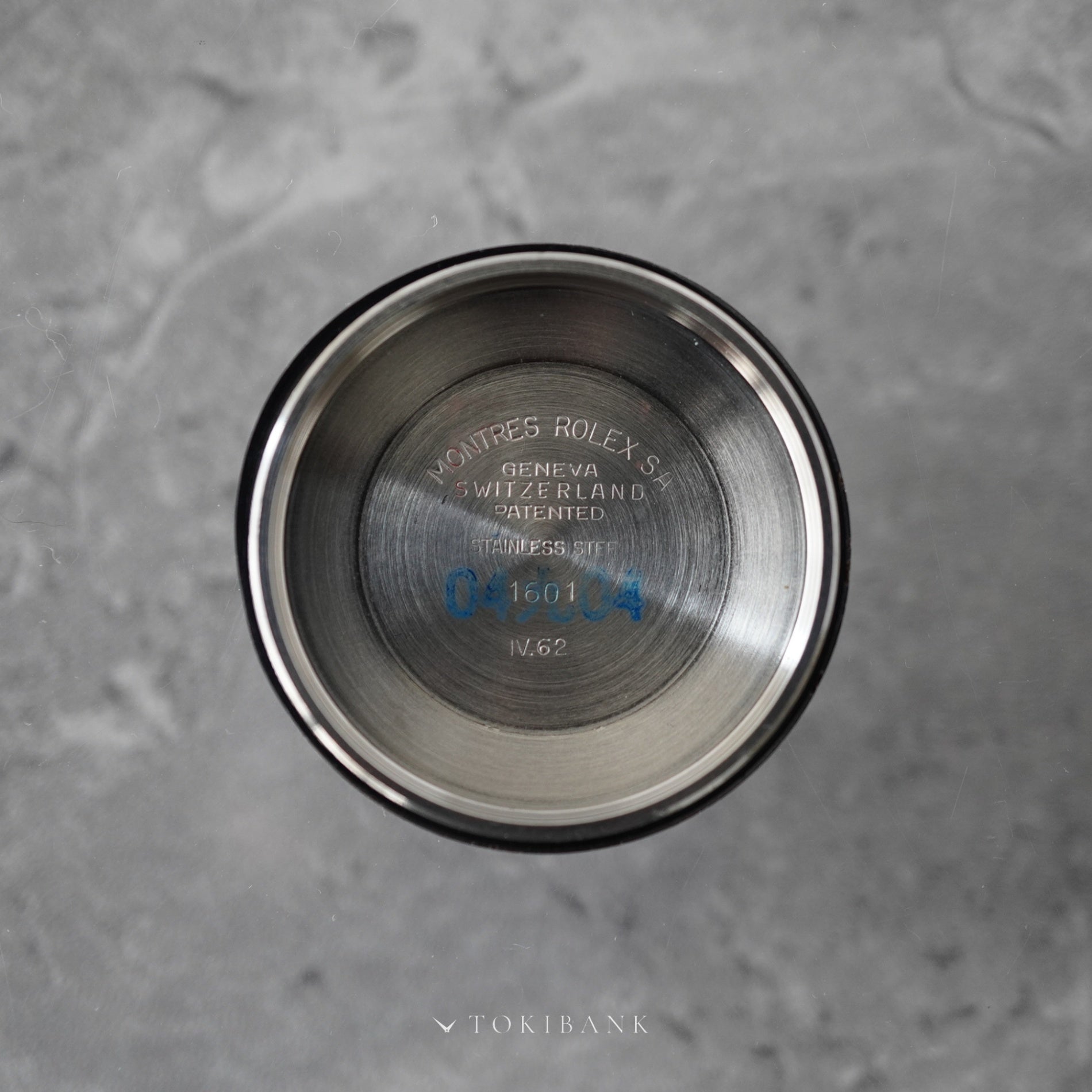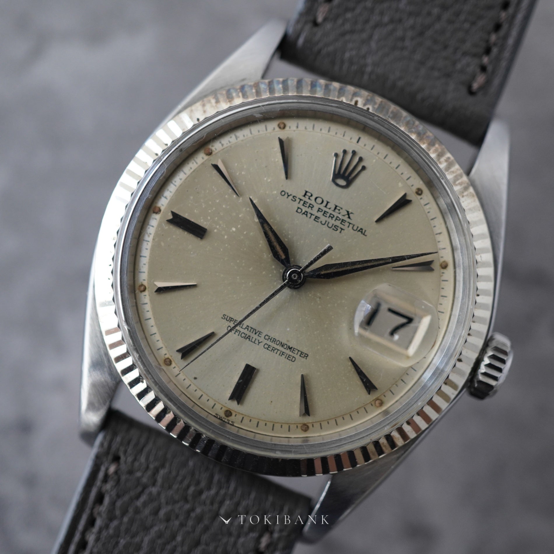 1962年製のロレックス デイトジャスト Ref.1601。クサビ形インデックスとドーフィン針を備えた初期仕様で、自動巻クロノメーター Cal.1560 を搭載しています。 ダイヤルには経年によるヤケや劣化が見られますが、当時の仕様を保った良好なコンディションです。