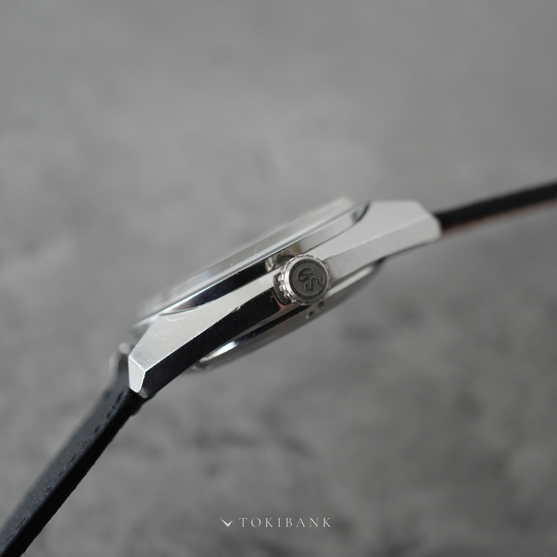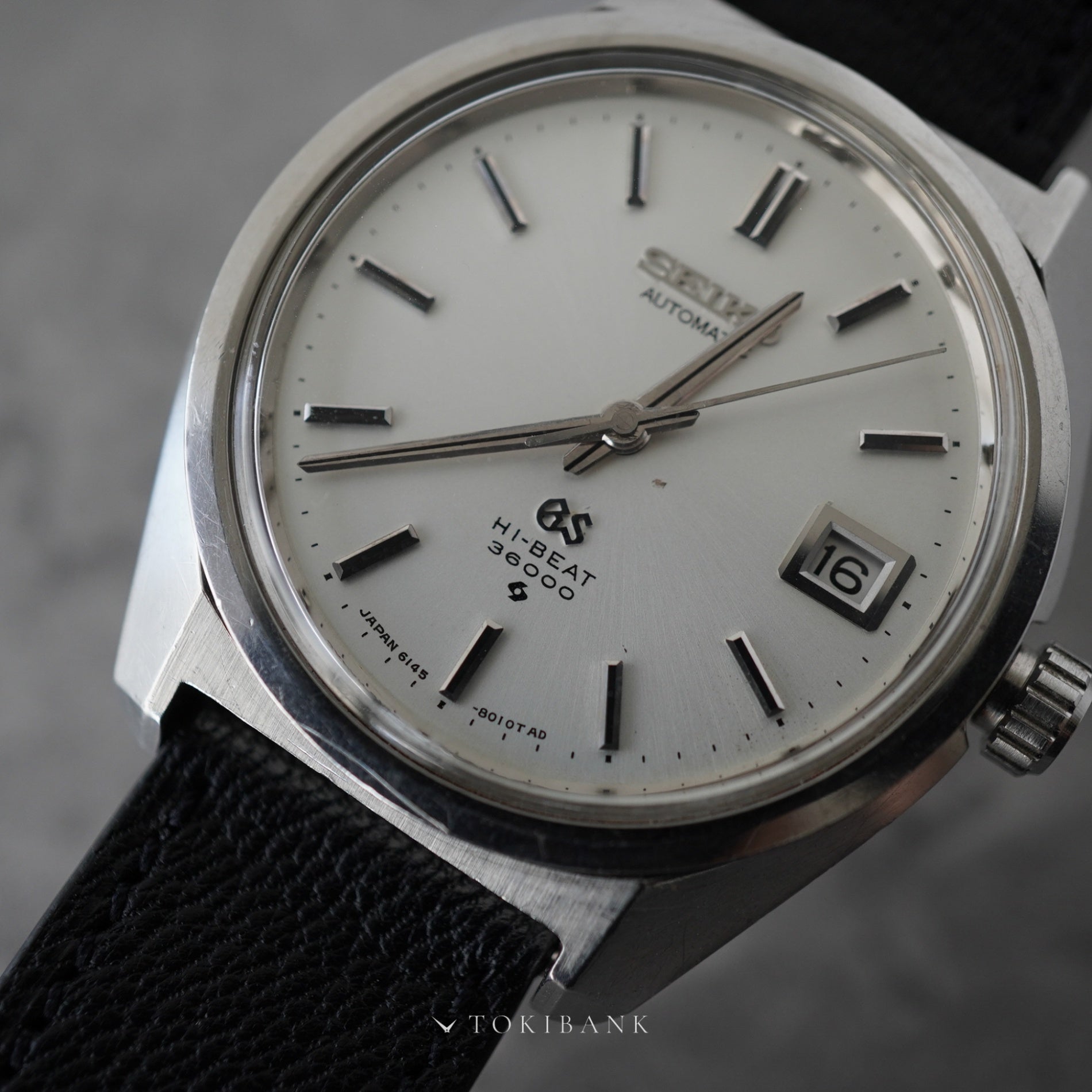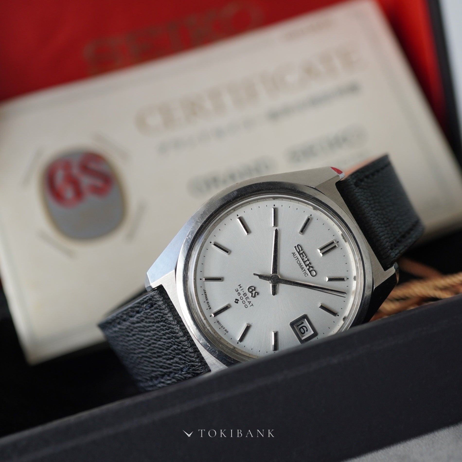 44GSから継承したセイコースタイルのケースに、国産初のハイビート自動巻ムーブメントを搭載したモデルです。 毎時36,000振動によって姿勢差の影響を受けにくい高精度を実現しています。 文字盤中央部にわずかな傷があり、裏蓋にも線傷が確認できますが、全体的なコンディションは良好です。 ケースのエッジや裏蓋のメダリオンも美しく残っており、当時の「グランドセイコー基準合格証明書」と専用ボックスが付属する希少な一本です。