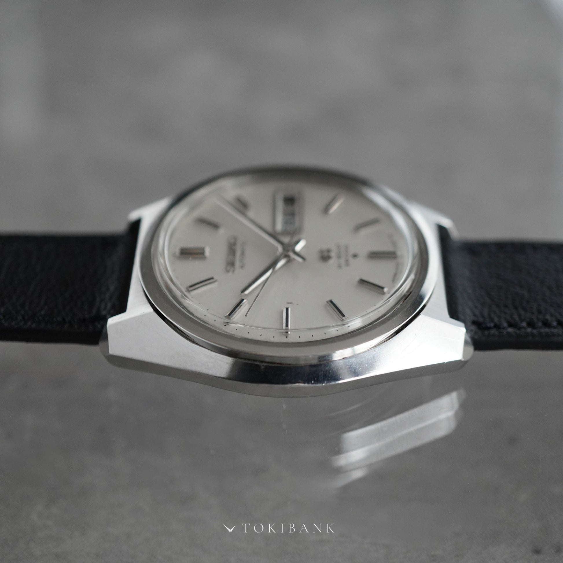 44GSから継承したセイコースタイルのケースに、国産初のハイビート自動巻ムーブメントを搭載し、毎時36,000振動によって姿勢差の影響を受けにくい高精度を実現したモデルです。 メンテナンス性に優れたマジックレバー機構と、日付・曜日表示を備え、サンレイ仕上げのADダイヤルや裏蓋メダリオンも良好な状態を保つ、実用性と美観を兼ね備えた一本です。